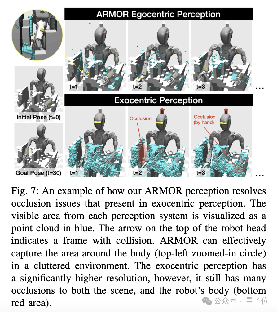 执行扫尾显露,与使用四个头戴式和外部装置的深度相机(外心感知)比较,ARMOR 系统使碰撞裁汰了 63.7%!