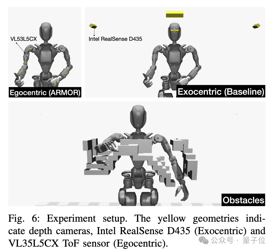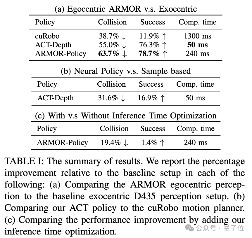 与使用四个头戴式和外部装置的深度相机(外部感知)的传统计谋比较,ARMOR 系统在避障性能上获得了权贵提高,碰撞裁汰 63.7%,得手率提高 78.7%。