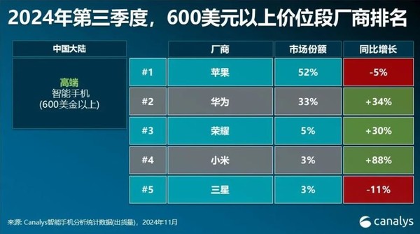 近日,全球知名的科技市集寂然分析机构Canalys公布了2024年第三季度高端智高手机市集份额数据。从全球市集来看,在2024年第三季度600好意思元以上价位段,市集份额名次分袂为苹果63%、三星21%、华为8%、谷歌2%以及荣耀2%。在中国大陆市集,2024年第三季度600好意思元以上价位段,苹果以52%的市集份额稳居高端市集第一,华为以33%的市集份额紧随后来,之后三到五位的荣耀、小米和三星分袂是5%、3%、3%。